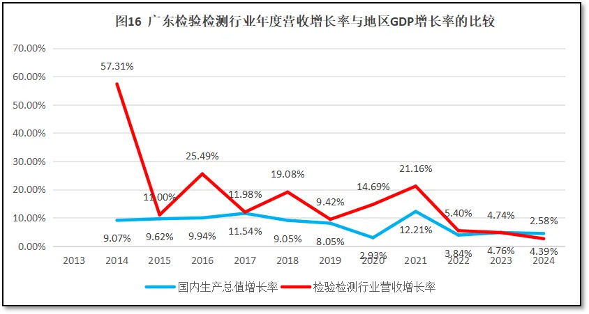 由图16可见,刨除第一年数据误差较大之外,从2015年起,广东省检验检测机构年度营收总额增长曲线始终在广东省GDP年度增长曲线之上波动,并逐步契合同频。这一方面说明广东省检验检测机构早期发展速度较快,呈现出比当地GDP增幅更高的增长率;另一方面也说明,随着时间的推移,广东省检验检测市场的成熟度不断提高,广东省检验检测机构营收总额的增长变化律动与广东省宏观经济发展指标日益同频,变化规律趋于一致。不过,2024年,广东省检验检测机构营收增长率低于当地GDP增长率,说明检验检测行业发展速度慢于区域经济发展速度,已经落后于市场发展的需要。