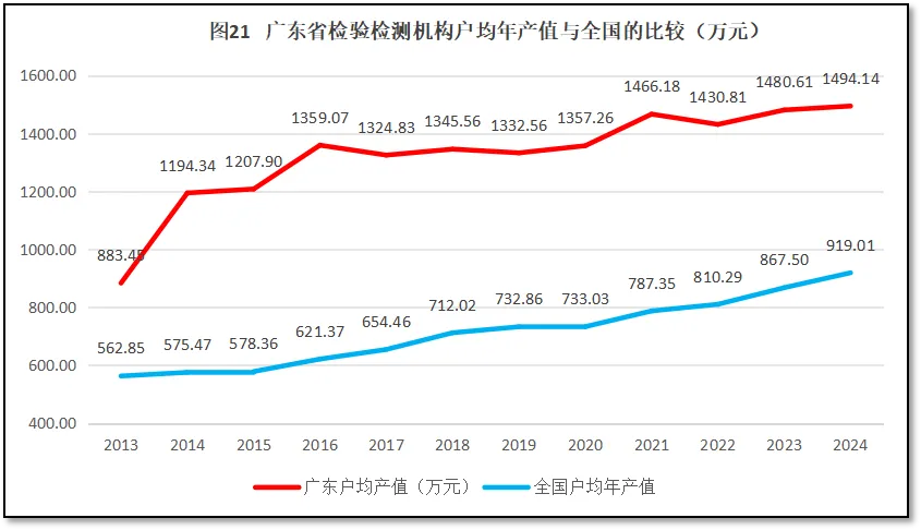 由图13可见,广东省检验检测机构户均对应的企业法人单位数量一直比全国平均水平高,这一方面说明广东地区制造业发达、企业数量众多,对检验检测行业来说市场空间大,还有不少发展机会;另一方面也说明广东省检验检测体系发展质量较好,规模与区域经济的适配程度仍保持在较好的水平。