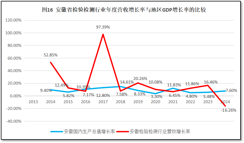由图16可见,安徽省检验检测机构营收总额多数年份的增幅高于其区域GDP增速,其中在2017年出现的一个97.39%的巨大增长峰值,大大拉高了安徽省检验检测机构年度营收总额的平均增长率。不过,2024年度安徽省检验检测机构营收总额增长率大幅下降,未能跑赢其区域经济GDP增长率,说明检验检测行业发展出现了停滞现象,从规模扩张向质量提升的转型阶段面临较大挑战。